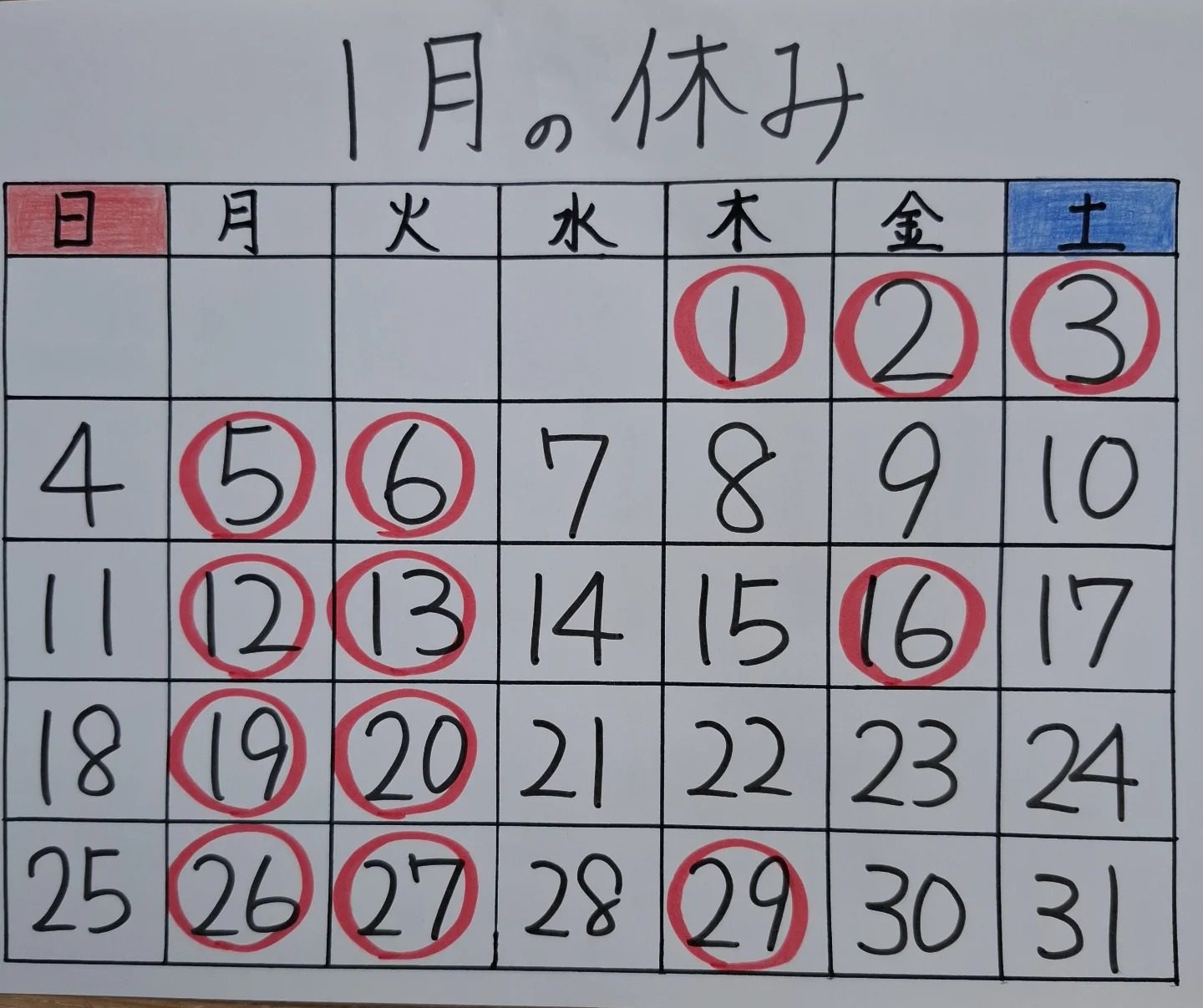1月休業日のお知らせ Posted 2026年1月5日 by YH0LdXQy4pzK Tweet いつもLe Trefle ~ル・トレフル~ホームページをご覧いただき、ありがとうございます。 1月休業のお知らせ 誠に勝手ではございますが、下記を休業日とさせていただいております。 ■休業日 ※詳しくはInstagramまたは、SHOPに掲載しているカレンダーをご確認ください。 お客様にはご不便とご迷惑をお掛けいたしますが、ご了承の程、よろしくお願いいたします。