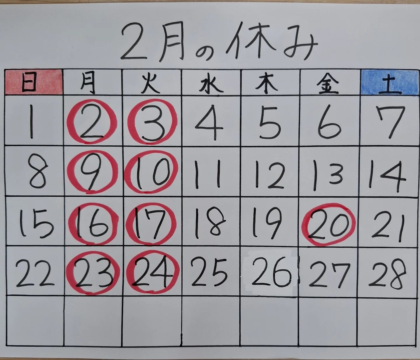 2月休業日のお知らせ Posted 2026年2月6日 by YH0LdXQy4pzK いつもLe Trefle ~ル・トレフル~ホームページをご覧いただき、ありがとうございます。 2月休業のお知らせ 誠に勝手ではございますが、下記を休業日とさせていただいております。 ■休業日 ※詳しくはInstagramまたは、SHOPに掲載しているカレンダーをご確認ください。 お客様にはご不便とご迷惑をお掛けいたしますが、ご了承の程、よろしくお願いいたします。