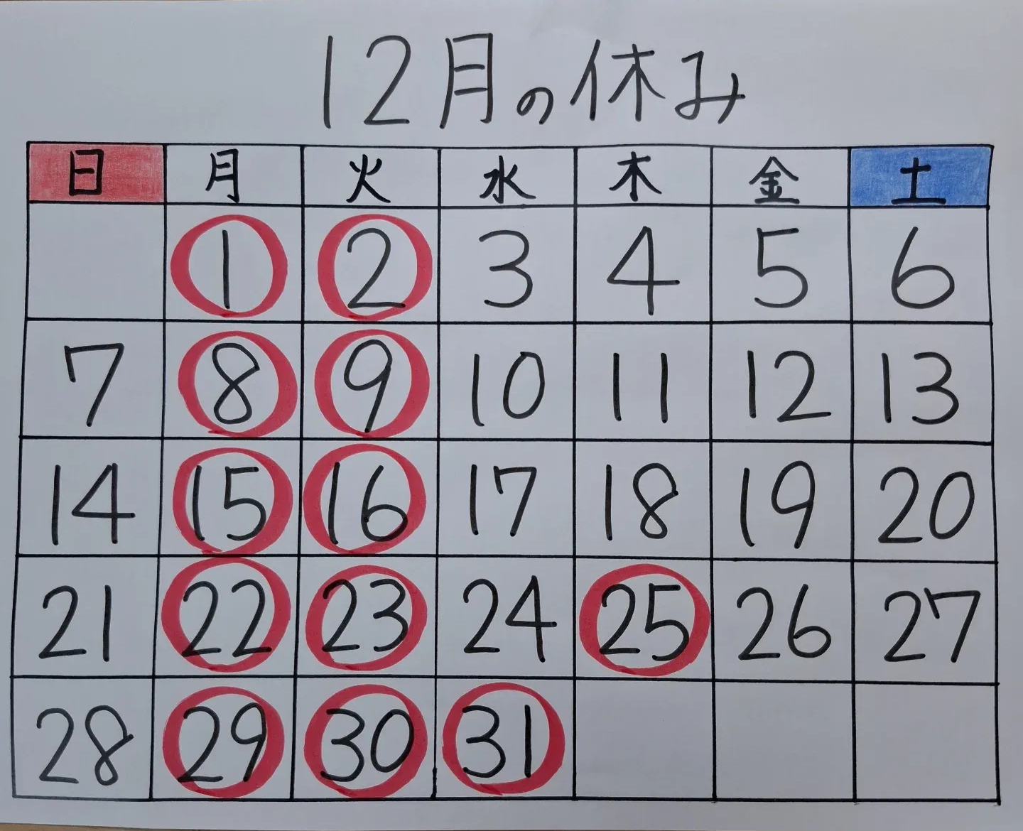 12月休業のお知らせ